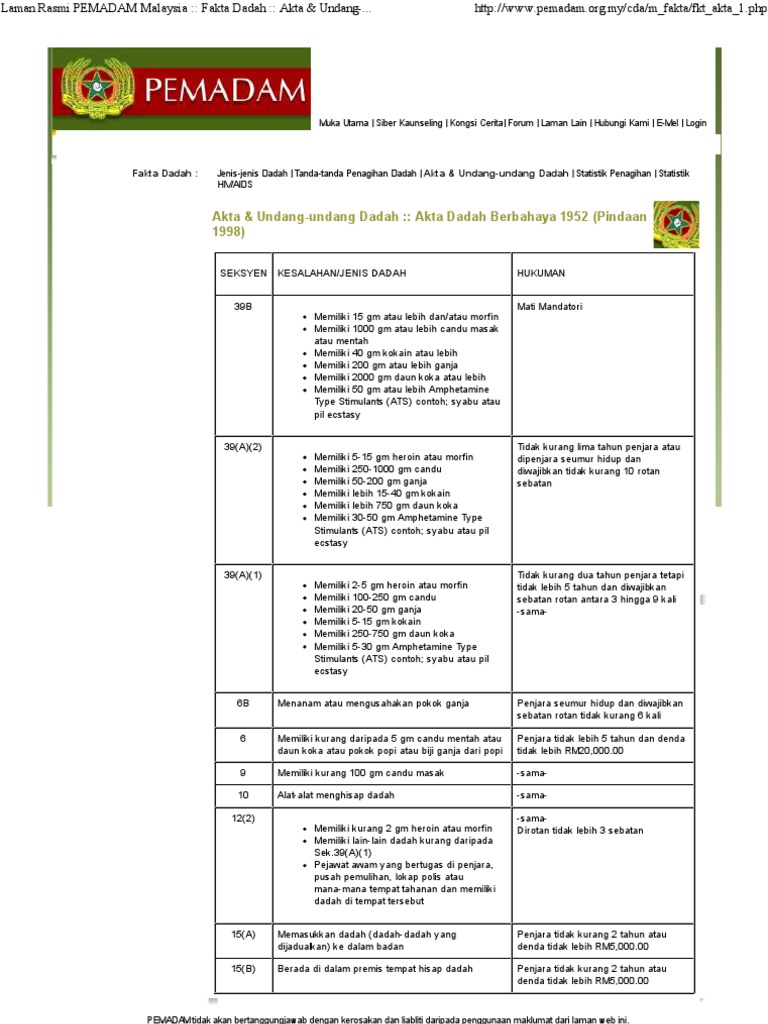 Dadah Di Pusat Hiburan Edisi Sabahan from beritasabah.com O penjara tidak kurang daripada 5 tahun atau seumur hidup dan sebatan rotan tidak kurang daripada 10 kali sebatan. Akta dadah berbahaya 1952 bertujuan membuat peruntukan selanjutnya yang lebih baik untuk mengawal pengimportan, pengeksportan, pengilangan, penjualan dan penggunaan candu dan beberapa bahan dan dadah merbahaya tertentu. Seorang guru dan dua anaknya yang khayal menghisap dadah jenis syabu tergamam selepas polis melakukan serbuan di sebuah rumah di sundar di sini malam tadi. Polis mendapati suspek pernah ditangkap dan disiasat di bawah seksyen 15 (1)(a) akta dadah berbahaya 1952. Polis juga meminta sesiapa yang mempunyai maklumat tentang lelaki terbabit supaya menghubungi ketua bahagian siasatan jenayah daerah nilai md nurazam md ghazali di. Polis turut menemui dadah eramin 5 di lantai kelab itu yang dipercayai dibuang oleh pengunjung kelab, kata beliau selepas operasi itu. Dadah berbahaya yang disenaraikan di dalam perenggan (xi) hingga (xxiv) seseorang itu adalah dianggap melakukan kesalahan di bawah seksyen 39(a) akta dadah. Kes disiasat mengikut seksyen 15(1)(a) akta dadah berbahaya 1952.